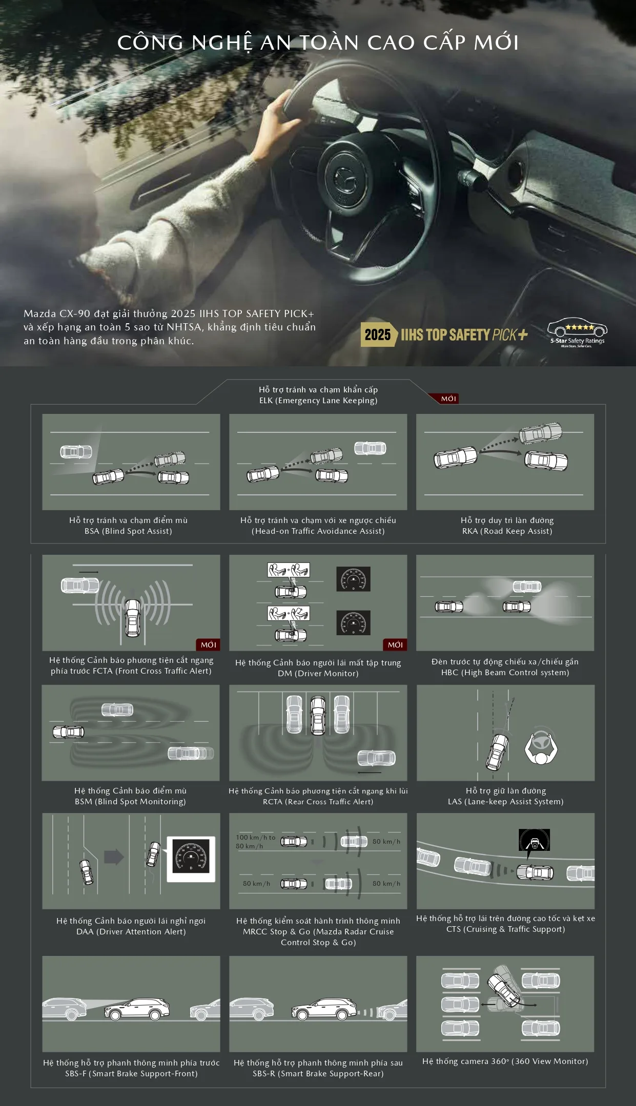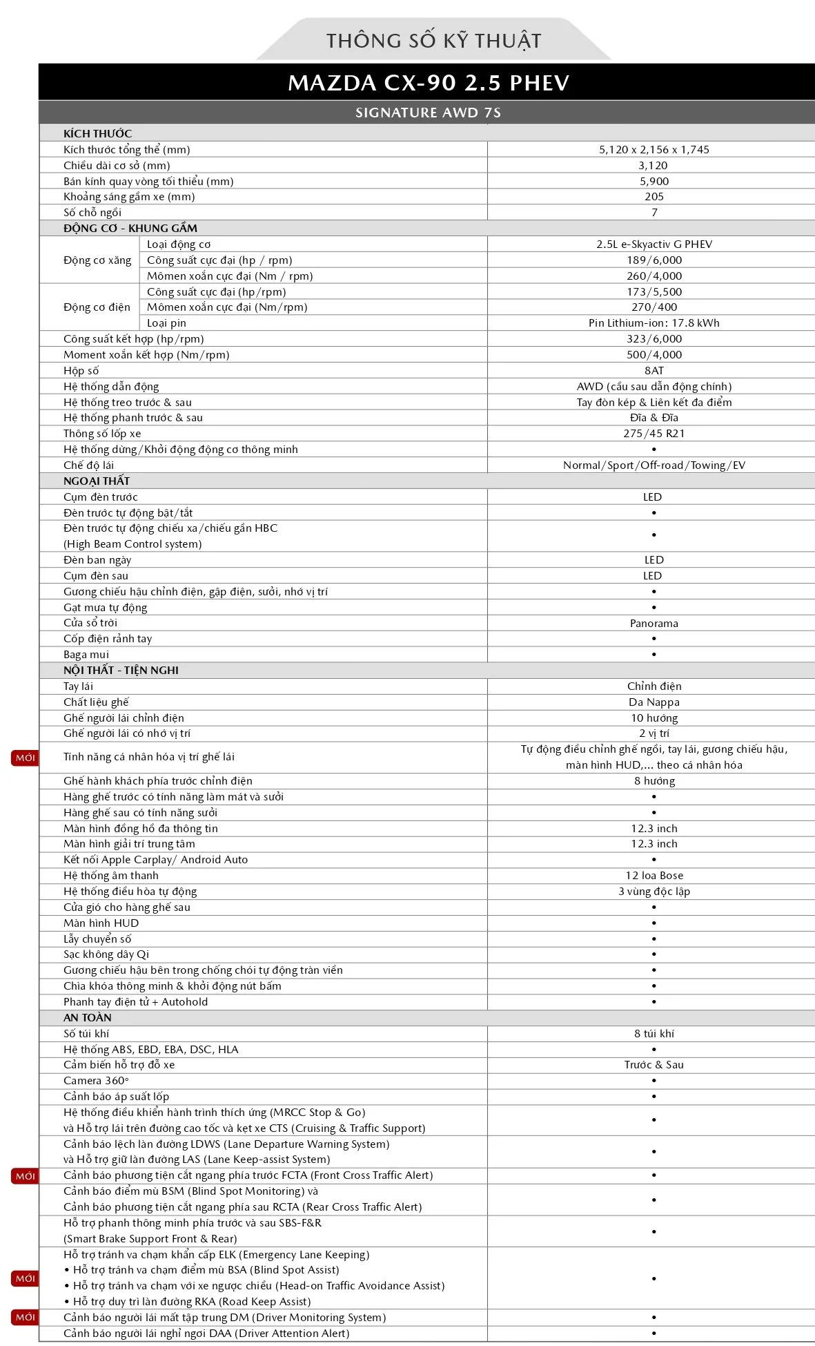 Bên cạnh đó, CX-90 được phát triển theo tiêu chuẩn an toàn 5 sao toàn cầu, đạt chứng nhận Top Safety Pick + từ IIHS (Mỹ). Theo hãng, xe sử dụng khung gầm với tỷ lệ thép cường lực cao, thép siêu cường đạt mức chịu lực đến 1.800 MPa tại khoang cabin hành khách và 1.300 MPa ở các khu vực chịu lực uốn cong. Xe trang bị 8 túi khí tiêu chuẩn cùng gói an toàn i-Activsense mới nhất.