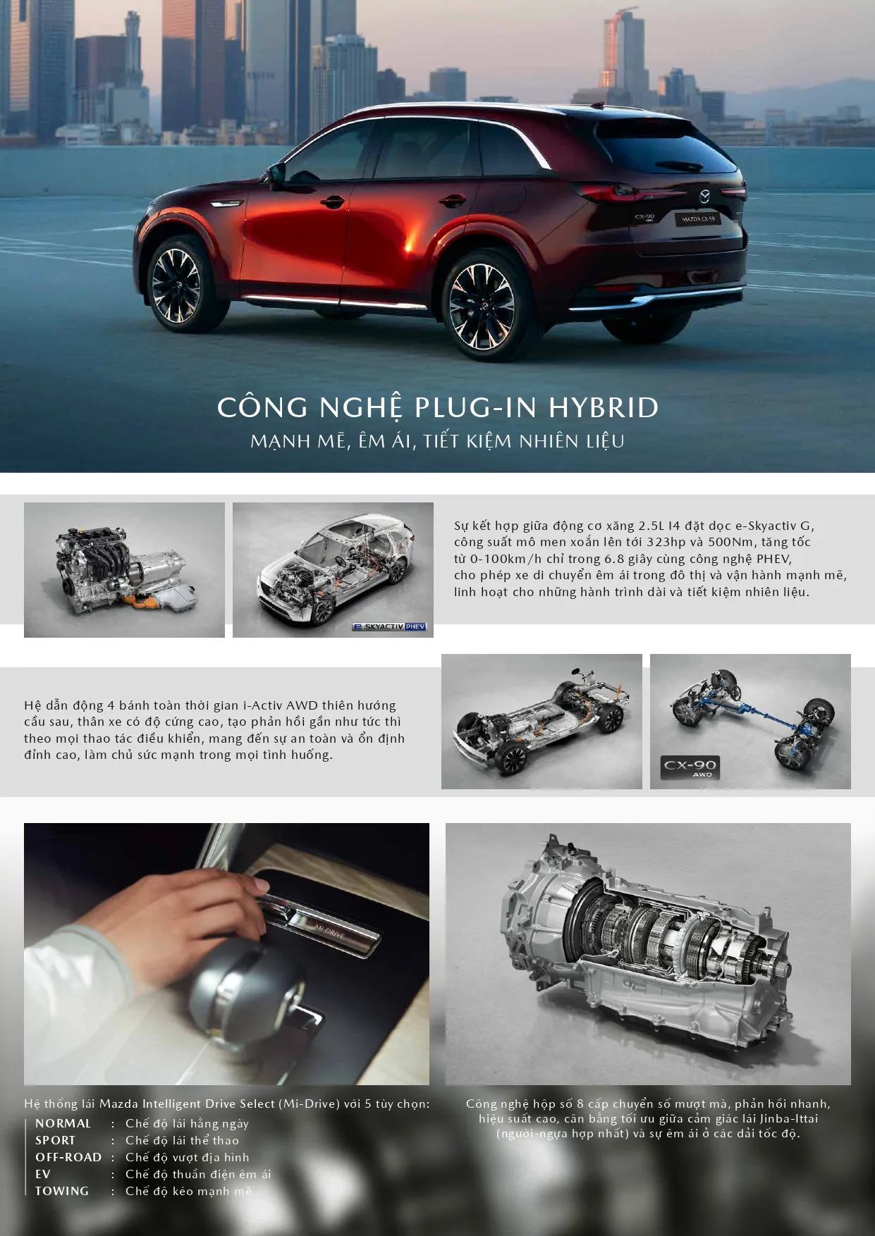 Mazda cũng tinh chỉnh hệ thống PHEV trên các dòng CX “hai chữ số” như CX-60, CX-80 và CX-90 để tối ưu phản hồi chân ga và mô-men xoắn. Xe kết hợp động cơ xăng 2.5 và mô-tơ điện, cho công suất tối đa 323 mã lực và mô-men xoắn 500 Nm, đi kèm hộp số tự động 8 cấp thế hệ mới. CX-90 trang bị 5 chế độ lái gồm: EV, Normal, Sport, Off-road và Towing. Trong đó, chế độ EV cho khả năng di chuyển phù hợp môi trường đô thị, sử dụng hàng ngày.