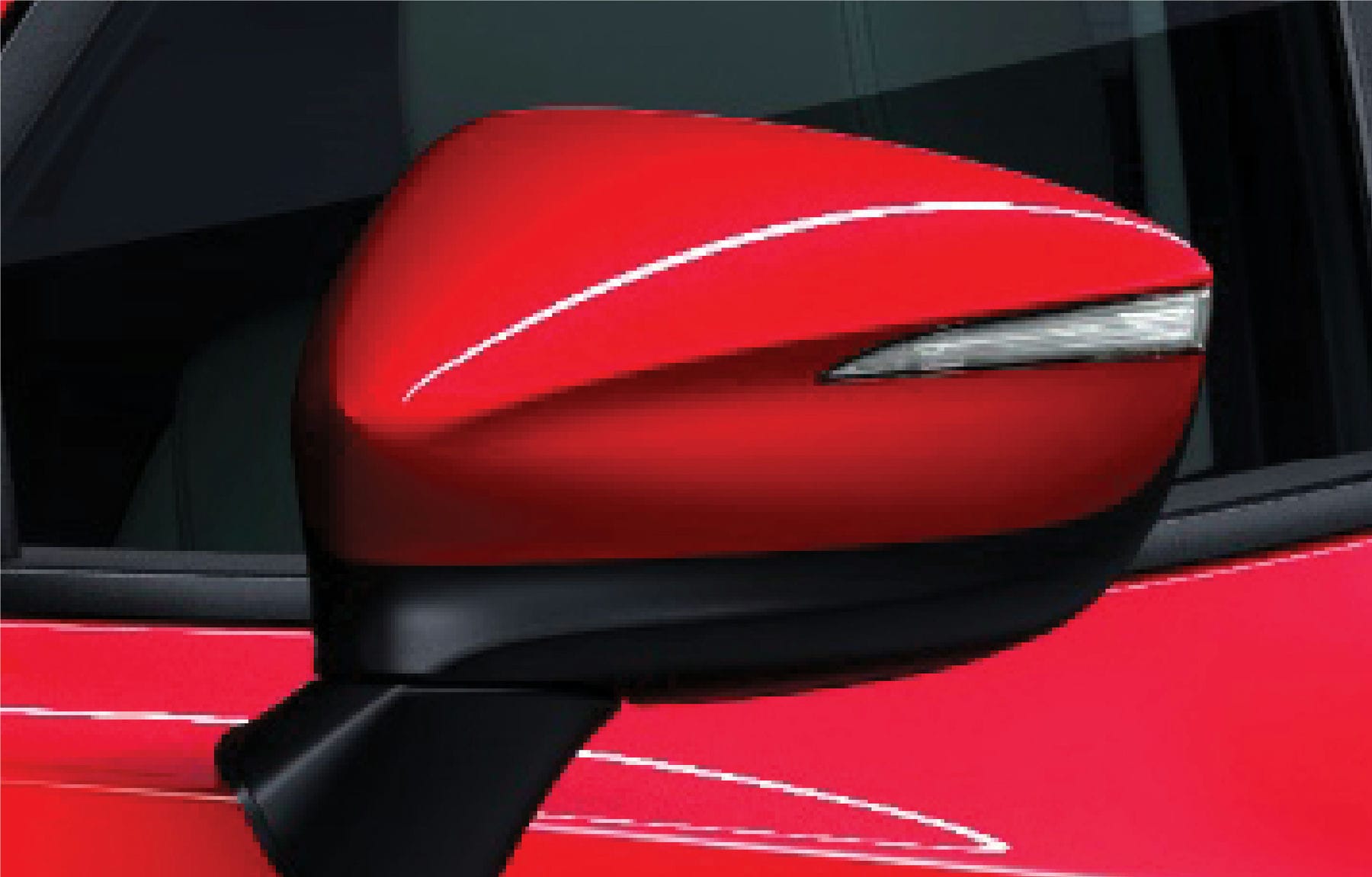 Gương chiếu hậu ngoài đồng màu thân xe, nhấn nhá bởi phần đế sơn đen, có chức năng gập điện/chỉnh điện tiện lợi.