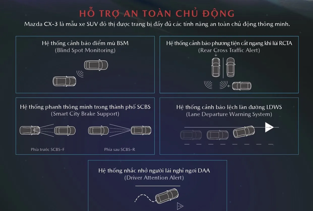 Hệ thống còn được bổ sung các công nghệ tiên tiến như cảnh báo chệch làn đường, phanh thông minh phía trước và sau trong môi trường đô thị, cùng tính năng nhắc nhở tập trung lái xe. Kết hợp với 6 túi khí, hệ thống phanh ABS, cân bằng điện tử và các trang bị an toàn cơ bản khác, CX-3 mang đến sự an tâm tuyệt đối cho mọi hành trình.