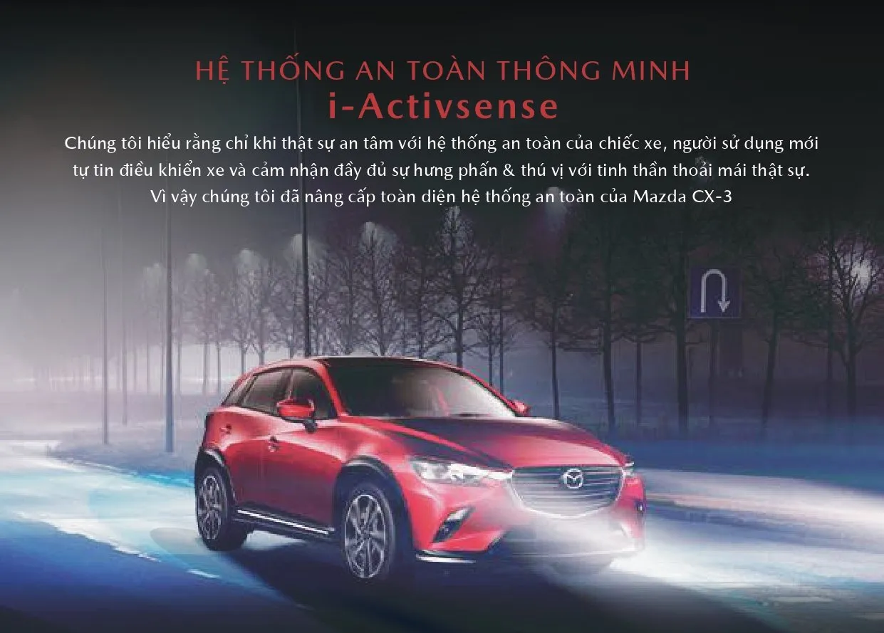 CX-3 được trang bị bộ giải pháp an toàn chủ động i-Activsense toàn diện, bao gồm nhiều công nghệ hỗ trợ lái xe hiện đại. Các tính năng như hỗ trợ khởi hành ngang dốc, camera lùi, cảm biến phía sau và cảnh báo phương tiện cắt ngang đảm bảo an toàn tối đa.