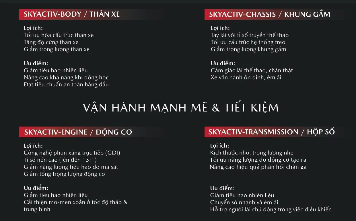 Công nghệ SkyActiv không chỉ tối ưu hóa quá trình đốt cháy mà còn giảm thiểu ma sát, giúp xe vận hành êm ái và bền bỉ theo thời gian.